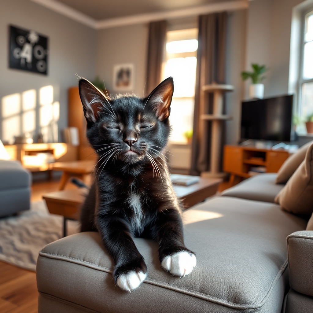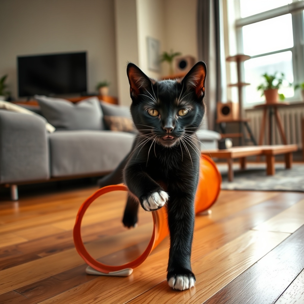 Blinker is our spunky young blind black cat with adorable white "sox" on all four paws! This fearless kitten doesn't let his blindness slow him down one bit - he zooms around the apartment like a tiny furry missile, using his incredible hearing and sensitive whiskers to navigate. At just 1 year old, he's full of boundless energy and mischief. He's the youngest of the founding family and keeps everyone on their toes!
